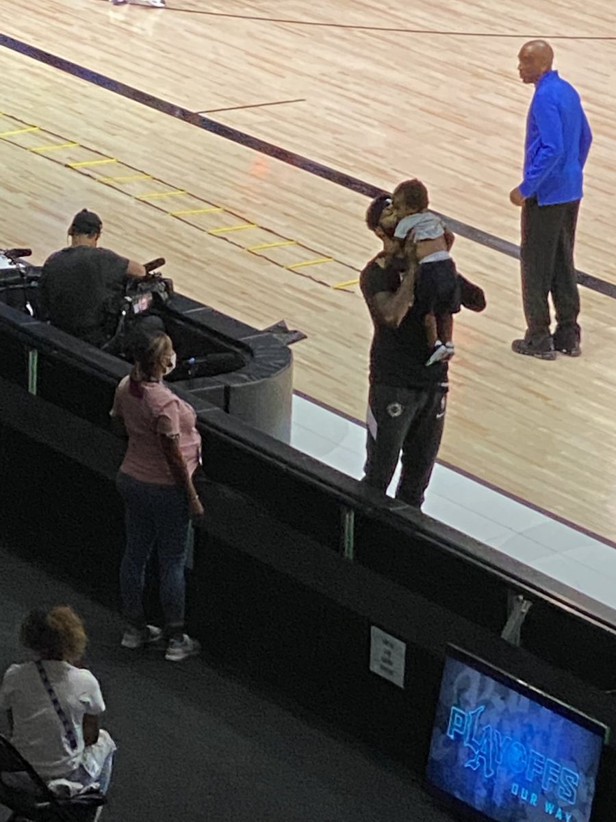 根据记者Dave McMenamin的报道,快船球员马库斯-莫里斯在本场比赛热身结束后抱起了场边观战的小马库斯-莫里斯。