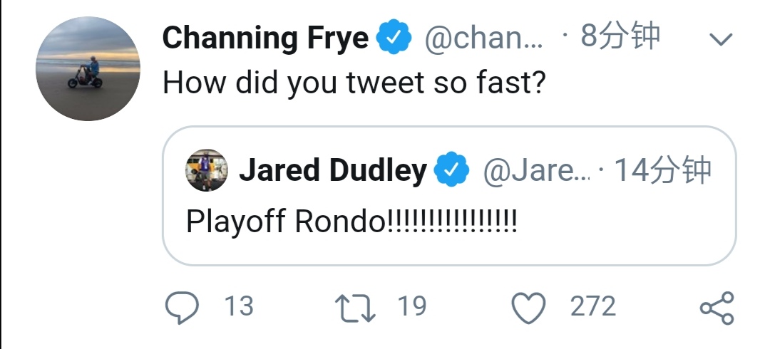 前NBA球员钱宁-弗莱调侃道:“你怎么发推发这么快?”