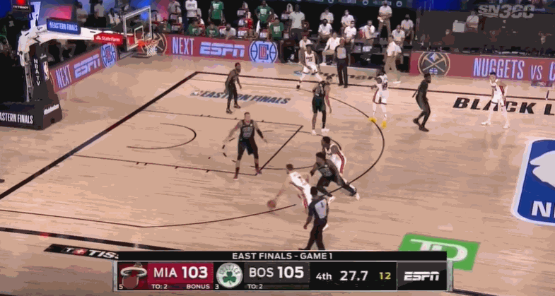 巴特勒在第四节还剩22秒时命中三分,热火106-105反超,但随后小琼斯在发球之前犯规,凯尔特人一罚一掷,塔特姆罚球追平后绝杀出手不中,双方进入加时。