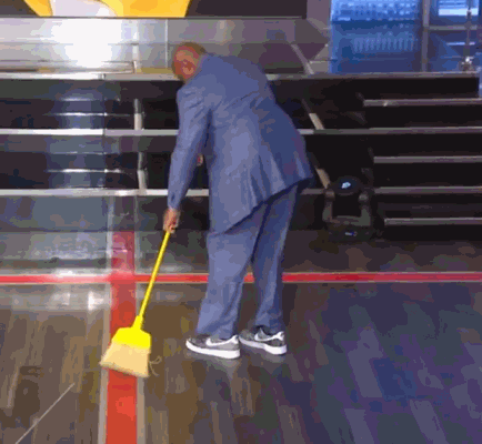 TNT赛后在推特上发布了评论员查尔斯-巴克利的视频,巴克利再次在演播室里拿起了扫把扫地。