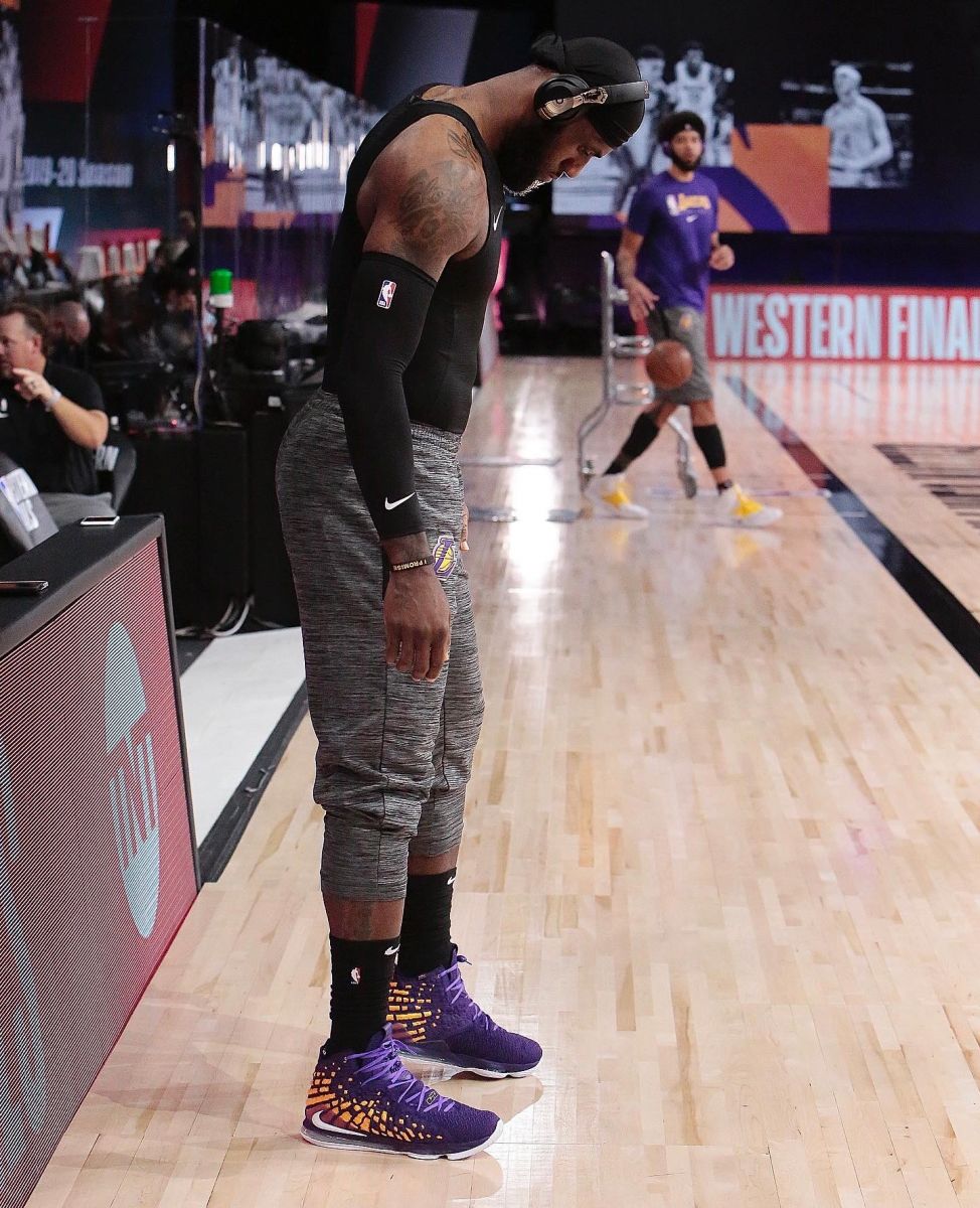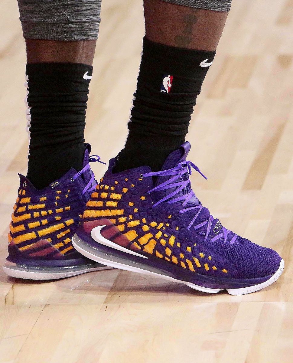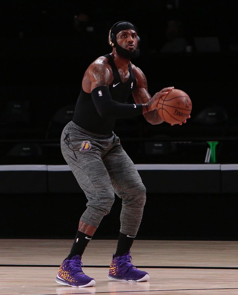 詹姆斯今日赛前穿着紫金配色的Nike LeBron 17战靴进行热身。