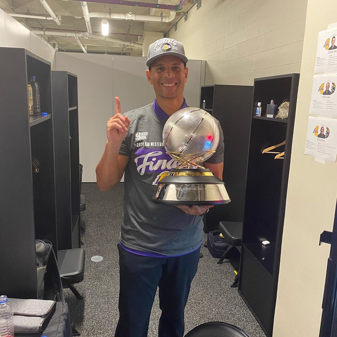 赛后,湖人助理教练迈尔斯-西蒙更新Instagram晒出一组照片(见新闻配图)庆祝胜利。