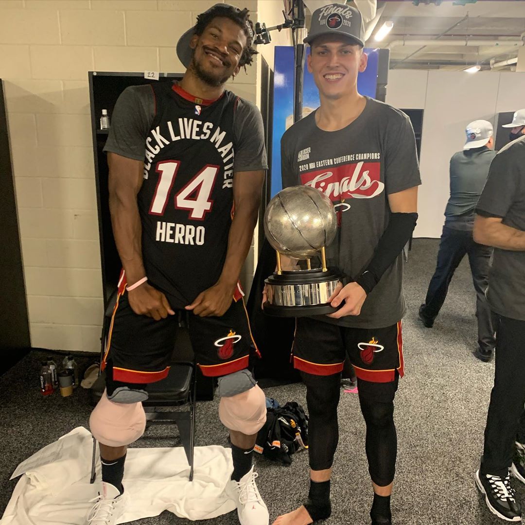赛后,热火新秀泰勒-希罗更新了个人Instagram,晒出热火全队的大合影、自己与女友的合照以及队友吉米-巴特勒穿着自己球衣与自己的合影庆祝球队挺进总决。