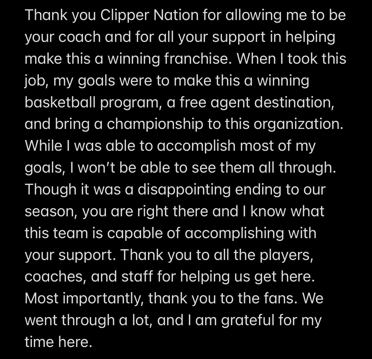 声明如下:“感谢你快船国度,感谢你允许我成为你们的主教练,感谢你们的全力支持帮助我打造了一支常胜球队。当我接手这份工作时,我的目标曾是把这打造一个成功的篮球项目,一个自由球员向往的归宿,并为这个俱乐部带来一个总冠军。虽然我完成了大部分的目标,但我没法见证它们全部实现了。虽然我们这个赛季的结局很遗憾,你们仍然与我们同在而且我知道有你们的支持快船能实现目标。感谢所有的球员,教练以及工作人员,感谢你们帮助我走到今天。最重要的是,要对球迷们说谢谢。我们一起经历了那么多,我对我在这里的时光心怀感激。”