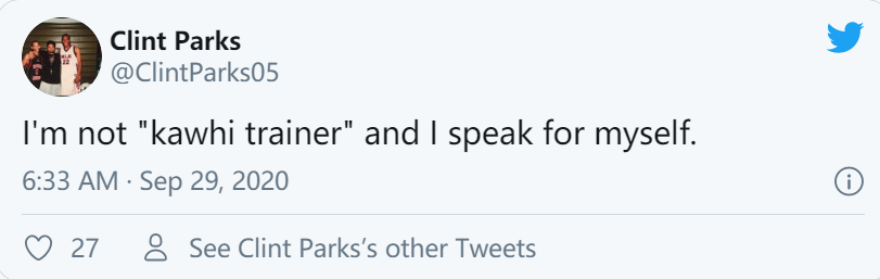 随后,帕克斯接着写道:“我并不是‘科怀的训练师’,我的言论代表自己。”(下图)