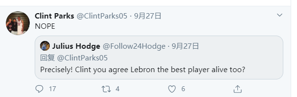 前NBA球员朱利叶斯-霍吉写道:“说得一阵见血!克林特,你也同意勒布朗(詹姆斯)是现役最出色的球员吧?”