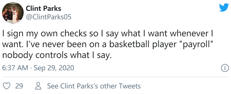 当地时间今天,帕克斯发推写道:“我的账单自己付,所以我想说什么就说什么,从未有球员花钱(让我说些什么),没有人能够控制我说什么。”(下图)