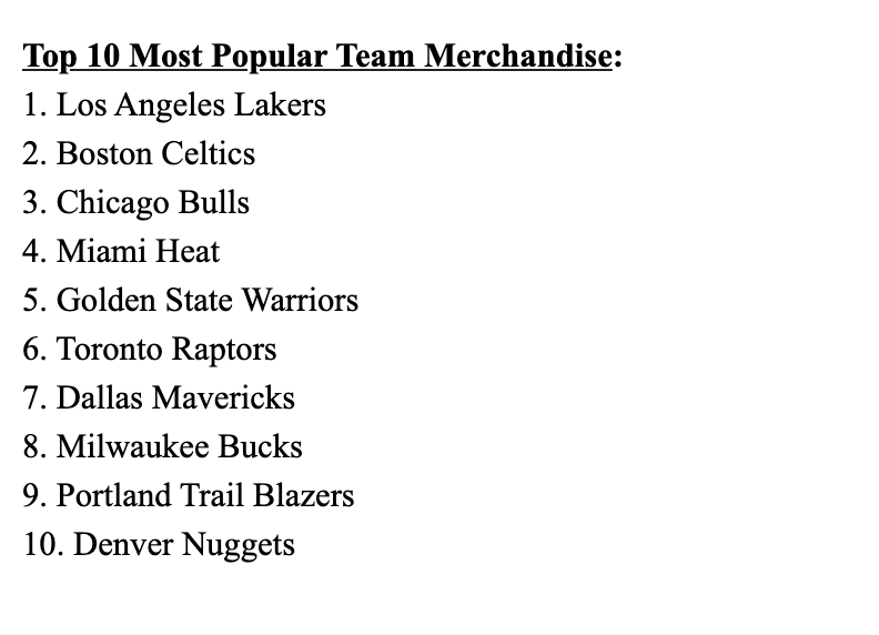 快速比分10月1日讯 NBA官方今日公布复赛开始以来(7月30日-9月28日)其官方商店的球队商品销量排名。具体如下: