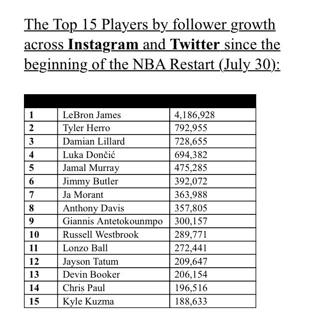 快速比分10月1日讯 NBA官方今日公布了自从复赛开始(7月30日)以来球员社交媒体推特和Instagram的粉丝数增长总量排名前15榜单。具体如下: