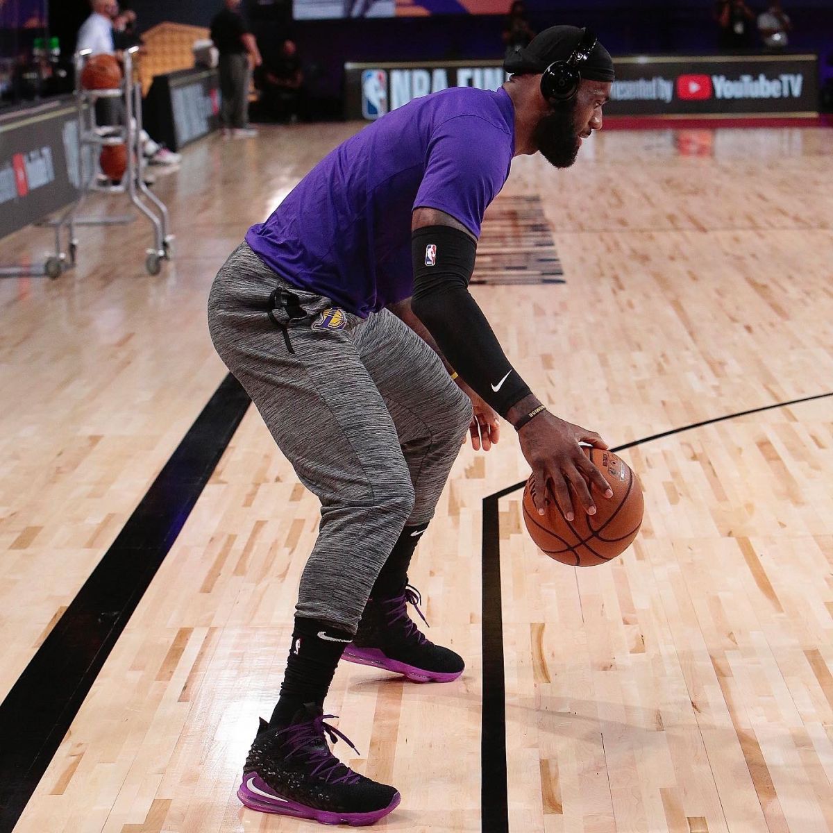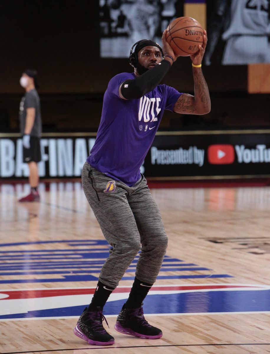 快速比分10月3日讯 湖人跟队记者Dave McMenamin今日通过Instagram发布一张湖人前锋勒布朗-詹姆斯的赛前热身照。