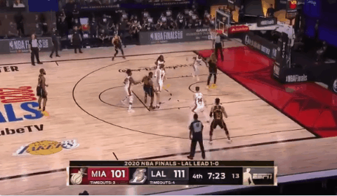 在第四节的一个回合中,热火球员肯德里克-纳恩封盖了安东尼-戴维斯的篮下出手。