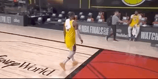 赛后,湖人球员肯塔维厄斯-考德威尔-波普和安东尼-戴维斯在结束采访后在场边等待队友勒布朗-詹姆斯采访结束,随后三人相互击掌示意,一起走回球员通道。