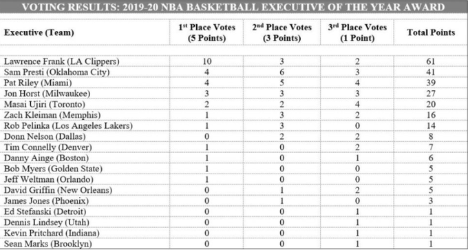 媒体公布了最佳球队经理的投票情况,弗兰克以61分位列第一,而雷霆高管萨姆-普雷斯蒂以41分位列第二,热火总裁帕特-莱利以39分位列第三。