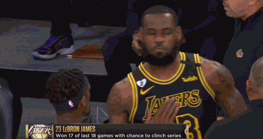 湖人前锋勒布朗-詹姆斯赛前来到裁判席,与队友击掌后,进行了标志性的撒镁粉仪式动作。