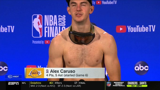 赛后,湖人后卫亚历克斯-卡鲁索赤膊上身,没穿衣服就去参加赛后发布会了。