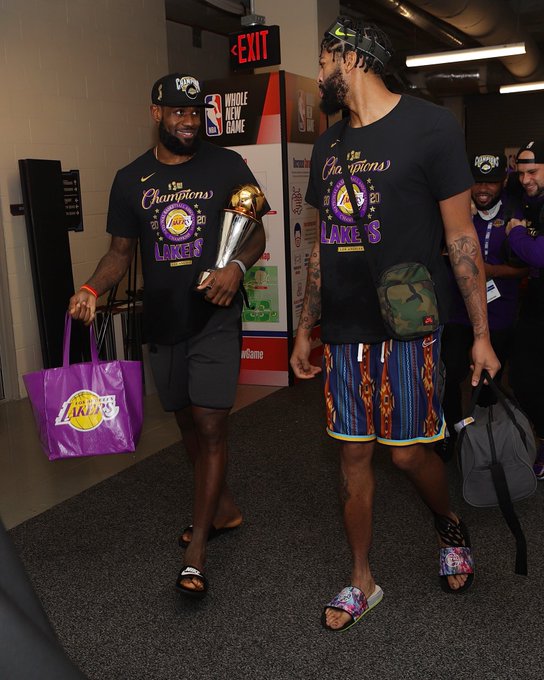 NBA官方晒詹姆斯戴维斯离开球馆合影:冠军已经离开球馆">