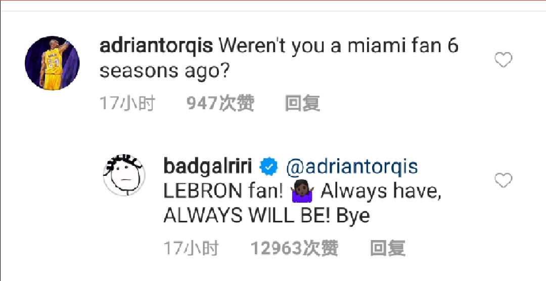 蕾哈娜回复:“我是勒布朗球迷!一直都是,也永远会是!拜拜!”