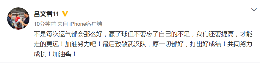 他在微博中这样写道:“不是每次运气都会那么好,赢了球但不要忘了自己的不足,我们还要提高,才能走的更远!加油努力吧!最后致敬武汉队,愿一切都好,打出好成绩!共同努力成长!加油!”