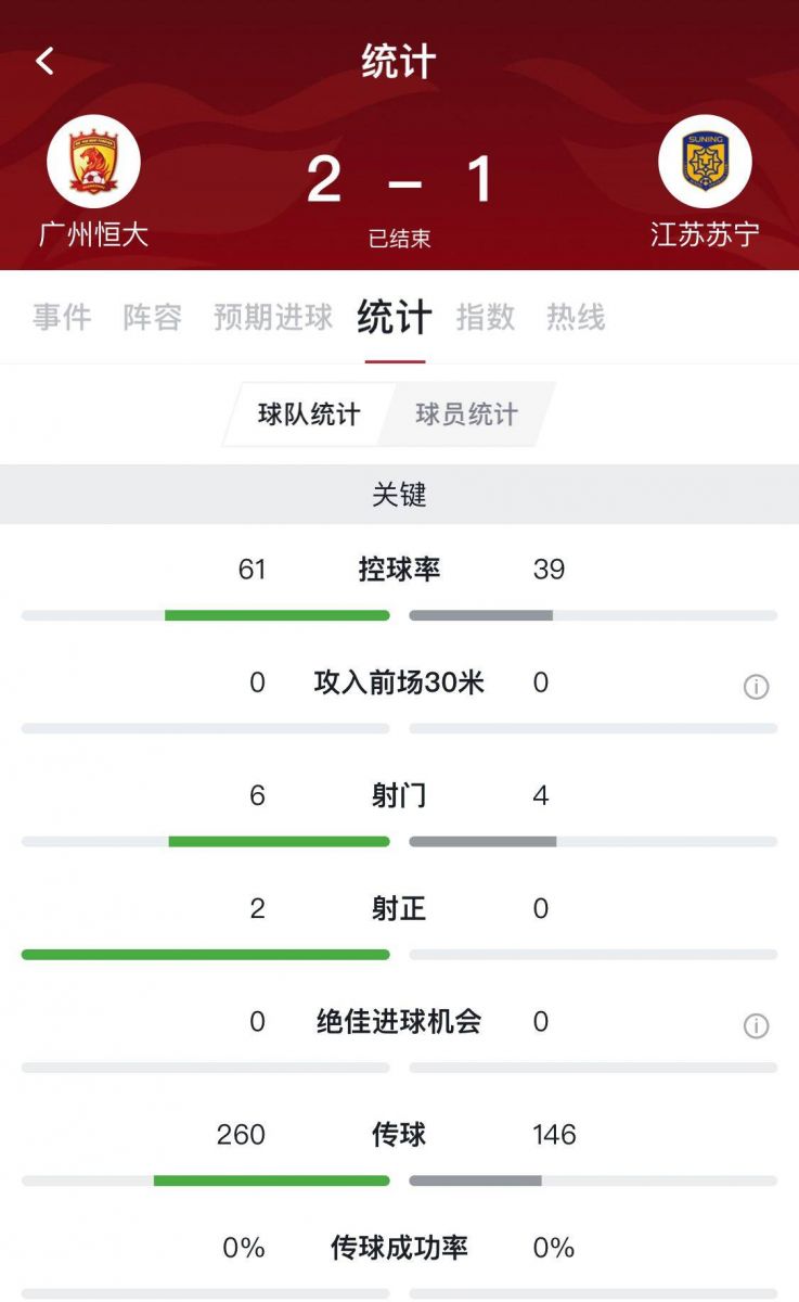 快速比分8月20日讯 晚18:00,中超第6轮的一场比赛在大连体育中心体育场展开,广州恒大2-1江苏苏宁。上半时杨立瑜造点,艾克森一蹴而就,张琳芃两次飞铲犯规累计两张黄牌被罚离场。下半时埃德尔打入扳平一球,随后顾超出现巨大失误,保利尼奥笑纳大礼,最终恒大取得了比赛胜利。