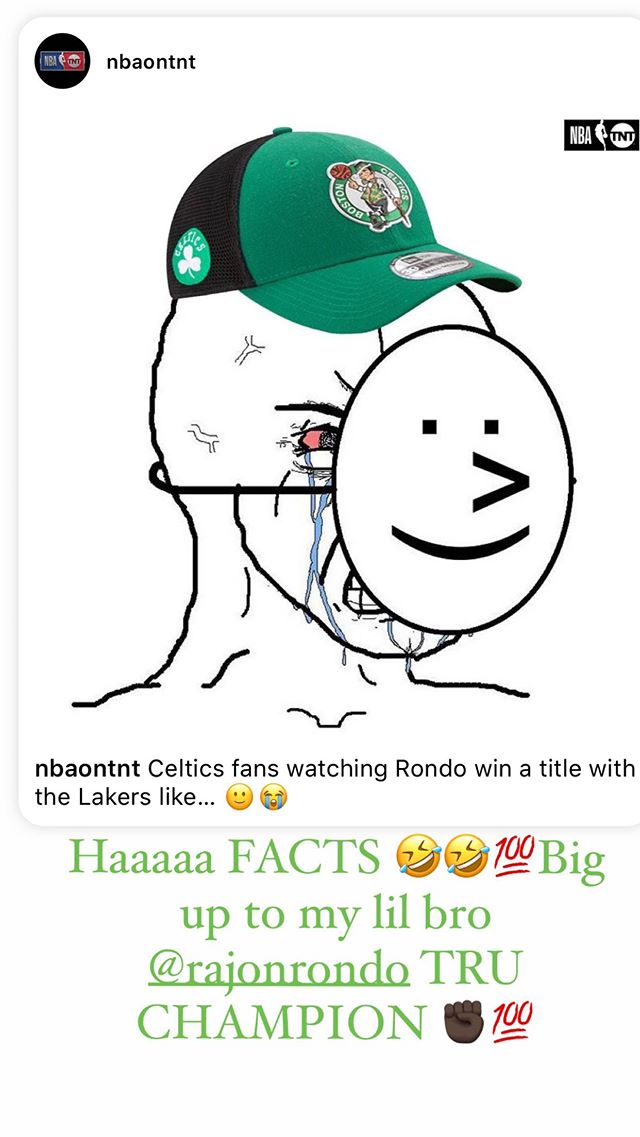 强颜欢笑!加内特转发凯尔特人球迷看到隆多夺冠趣图