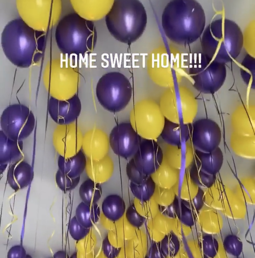 詹姆斯回家后自拍:紫金气球、回家第一餐、想念自家床