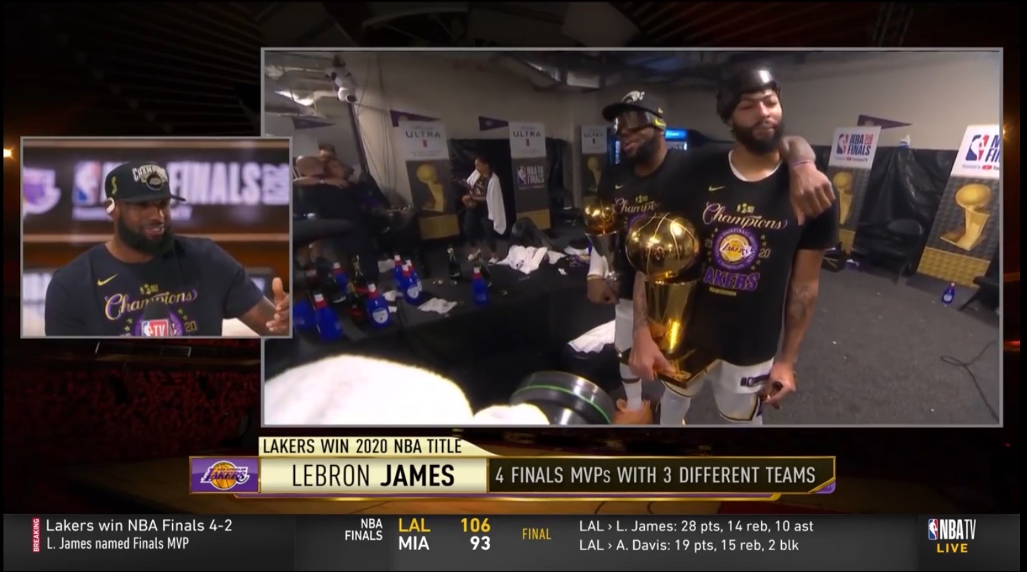 快速比分10月12日讯 在今日结束的总决赛第六场中,湖人以106-93击败热火,系列赛大比分4-2夺得总冠军。赛后,湖人前锋勒布朗-詹姆斯在场边接受了专访。