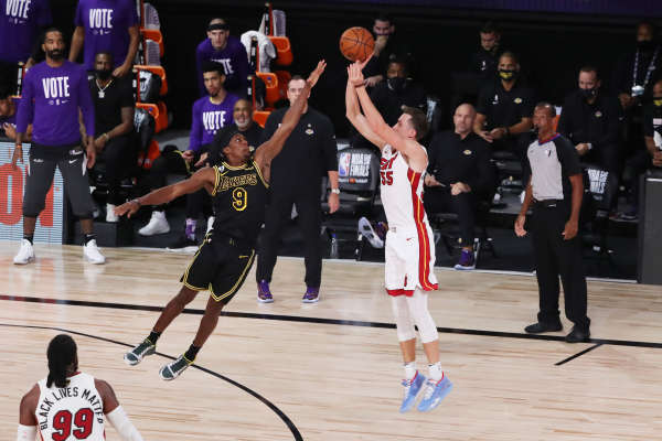 快速比分10月12日讯 热火在今天的比赛以96-103不敌湖人,大比分2-4不敌对手,无缘总冠军。 今年季后赛至今,热火后卫邓肯-罗宾逊三分球合计156中