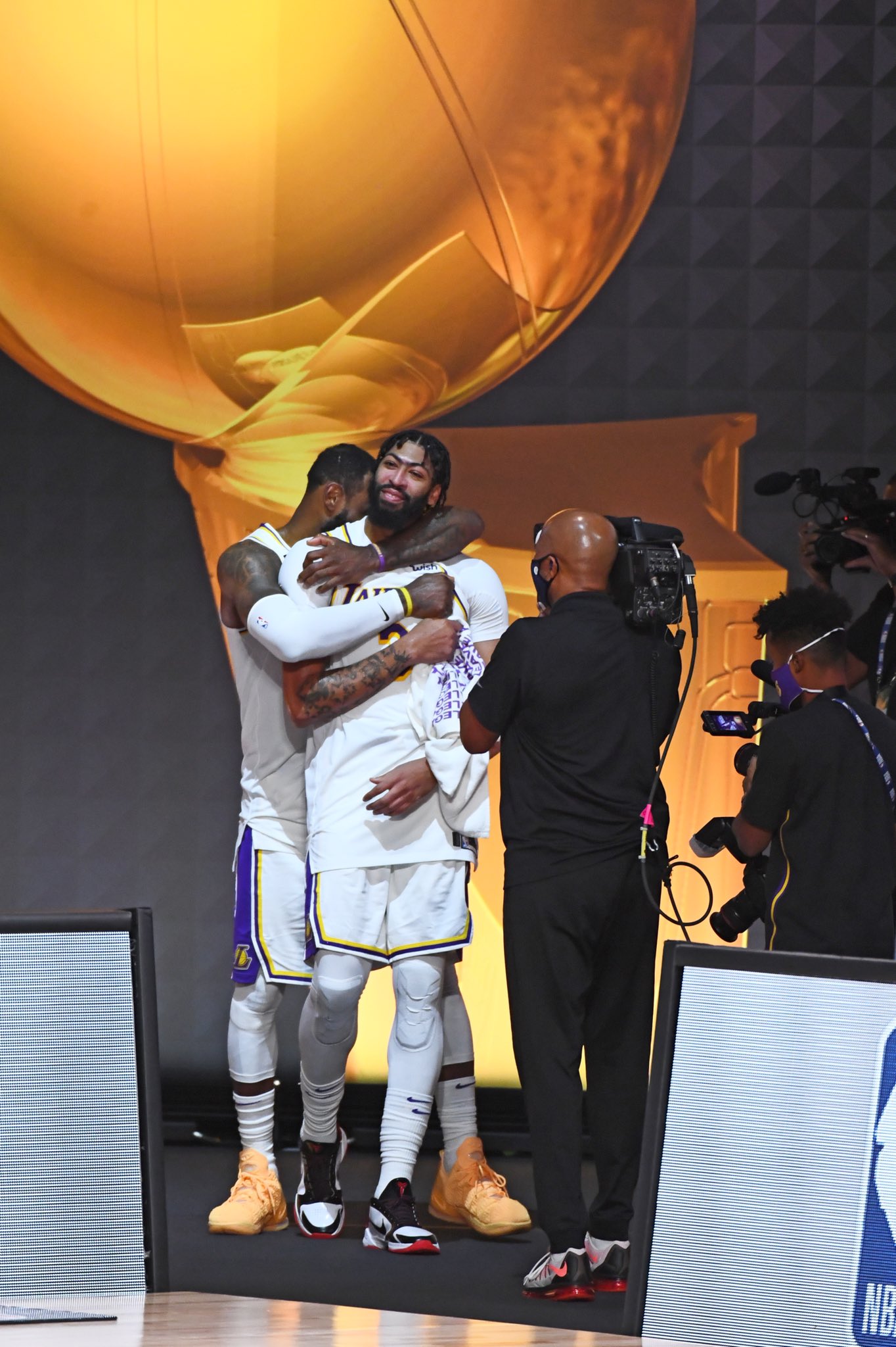 快速比分10月12日讯 湖人今天以106-93力克热火,大比分4-2夺得NBA总冠军。赛后,NBA官方推特晒出湖人球员勒布朗-詹姆斯和安东尼-戴维斯的合照(见新