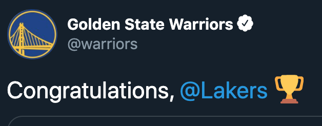 勇士官方祝贺湖人夺冠:恭喜你,湖人