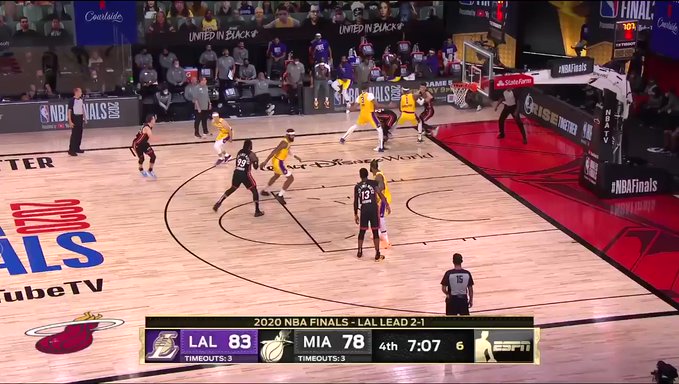 快速比分10月7日讯 今日湖人与热火的总决赛G4已战至最后一节,湖人暂时以90-87领先热火。 湖人前锋勒布朗-詹姆斯在过去的两个进攻回合里遭到热火前锋杰