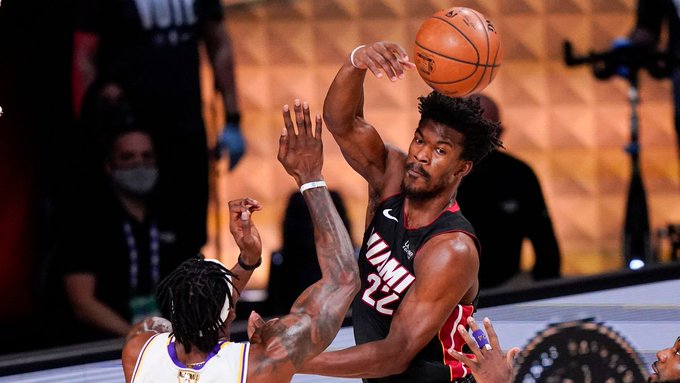 快速比分10月5日讯 在今天的比赛中,热火115-104击败湖人,总决赛1-2落后。 本场比赛,热火前锋吉米-巴特勒得到40分11篮板13助攻,湖人前锋勒