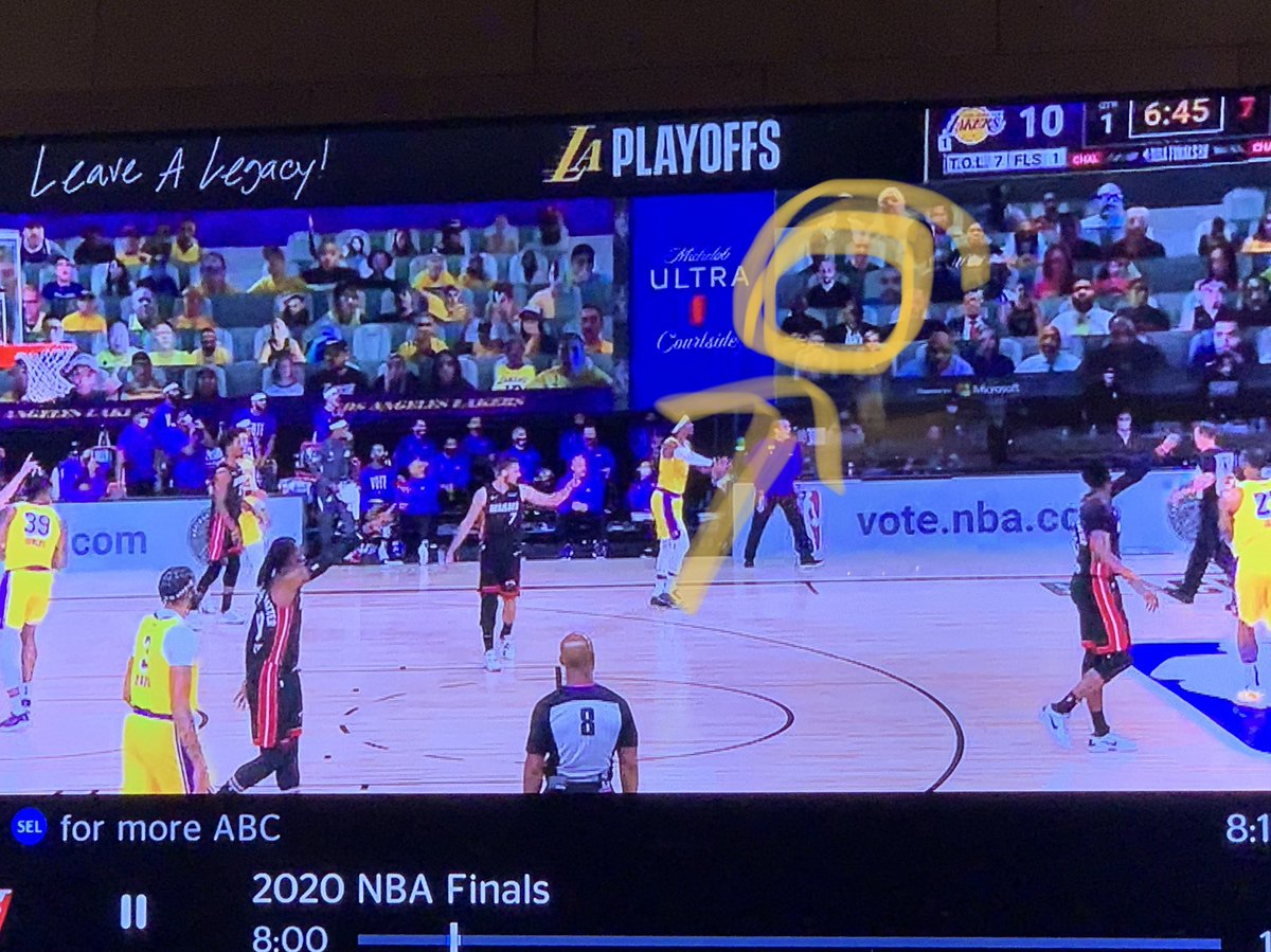快速比分10月1日讯 今日,湖人对阵热火的总决赛首场比赛目前正在进行中。 随后,一名名叫Many Orono发推晒出自己观看总决赛现场直播在现场虚拟观众大