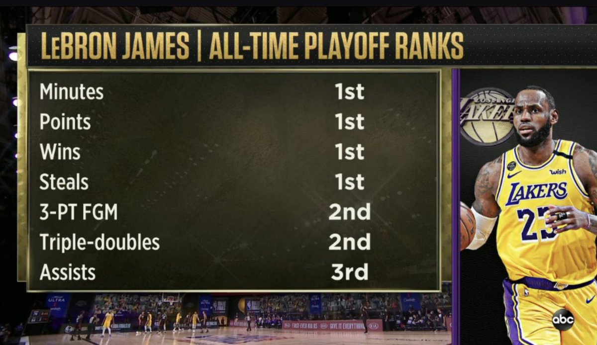 快速比分10月1日讯 在今日正在举行的NBA比赛中,热火与湖人的比赛正激战正酣。 赛中,美媒更新推特,晒出一张湖人球员勒布朗-詹姆斯生涯季后赛数据排名的图