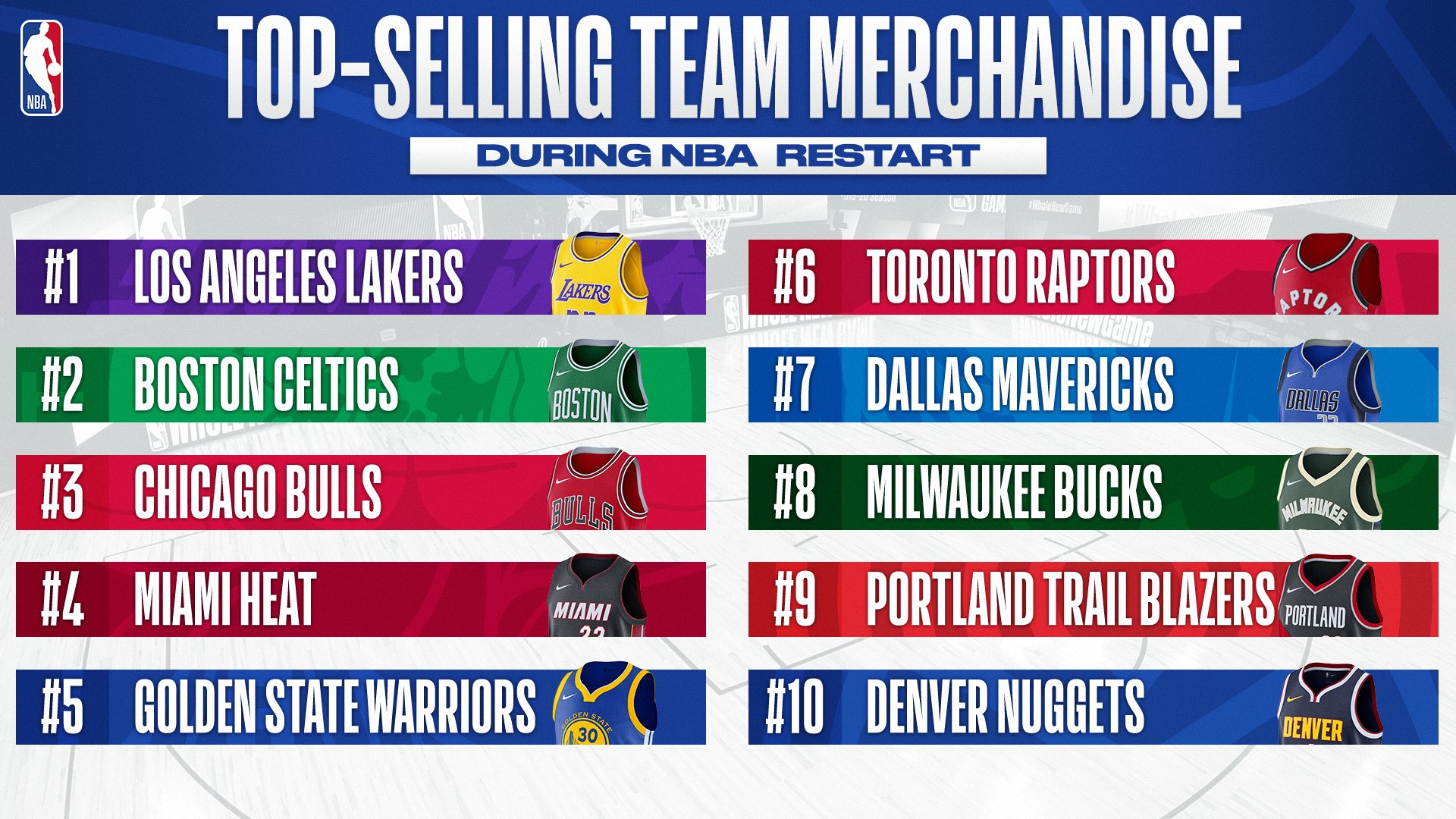 快速比分10月1日讯 NBA官方今日公布复赛开始以来(7月30日-9月28日)其官方商店的球队商品销量排名。具体如下: 最畅销的球队商品销量排名前10: