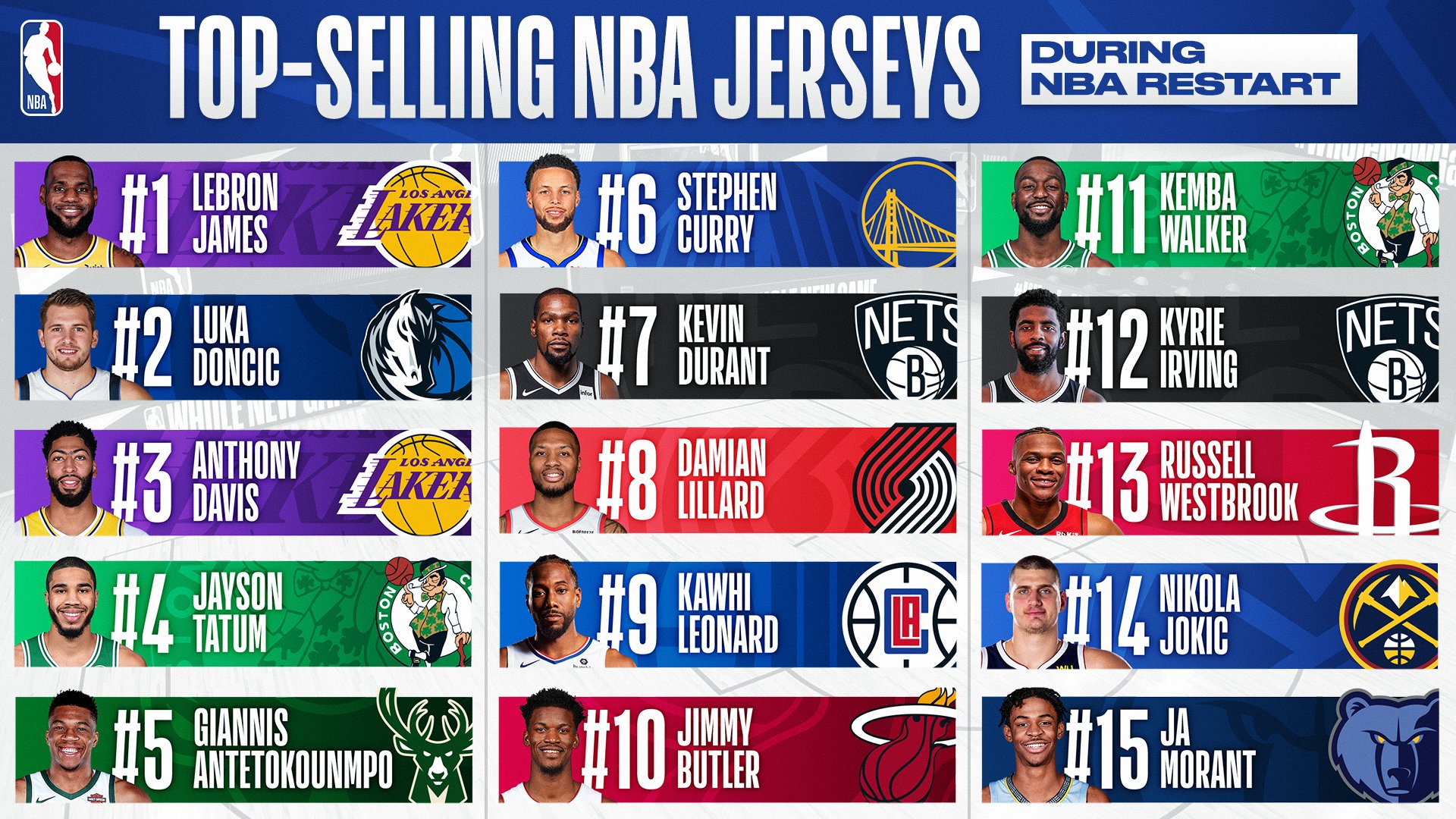 官方复赛球衣销量:詹姆斯领跑,东契奇戴维斯分列二三
