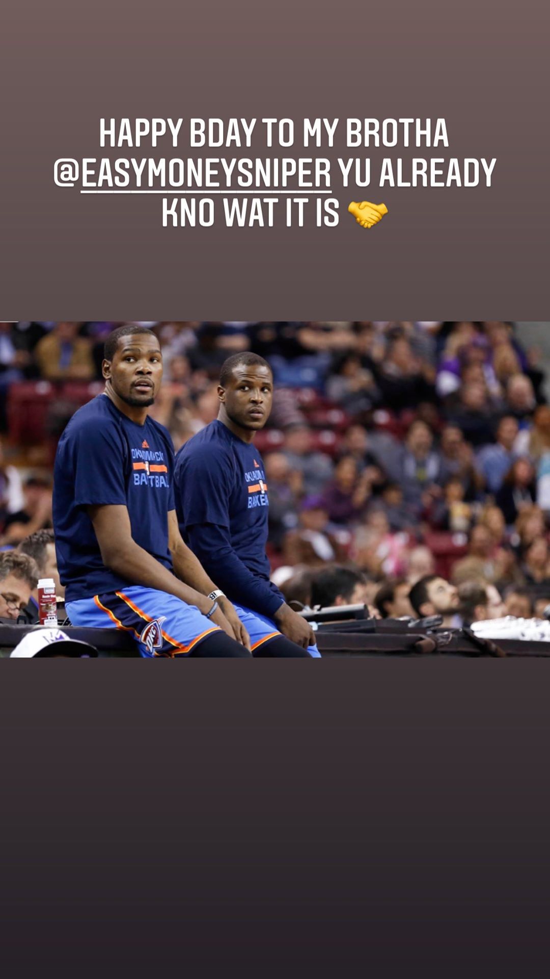 快速比分10月1日讯 今日,湖人球员迪昂-韦特斯更新了个人Instagram Story,晒出自己效力于雷霆时期与现篮网前锋凯文-杜兰特在场边的合影,为杜兰特送