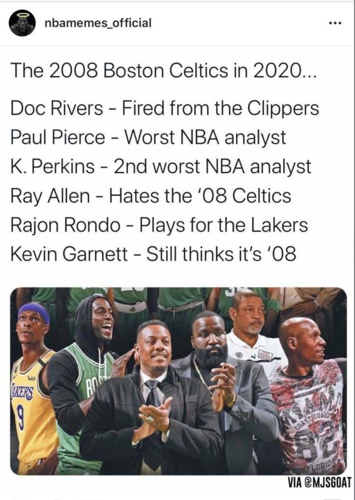 快速比分9月30日讯 今日,知名NBA梗图账号NBA Memes official制作了一张调侃08冠军凯尔特人成员2020年的现状的梗图。(见新闻配图)