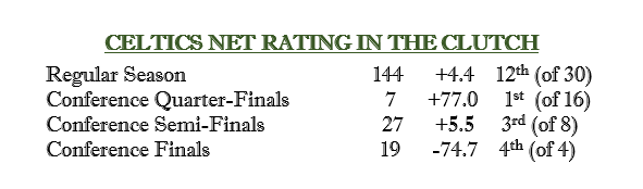 凯尔特人第一轮关键时刻的净胜分为+77.0,东决时为-74.7