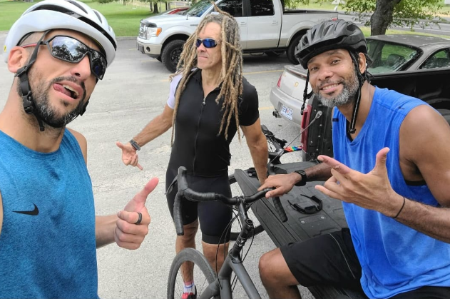 快速比分9月28日讯 马刺名宿马努-吉诺比利今日更新推特晒出一张与昔日队友蒂姆-邓肯以及好友一起骑自行车的照片(见新闻配图)。 配文写道:“今天骑了40公