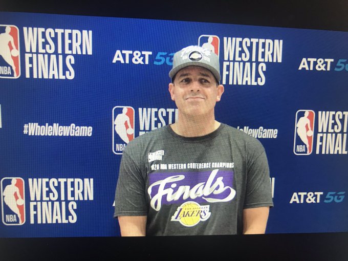 快速比分9月27日讯 湖人今天以117-107击败掘金,系列赛4-1淘汰对手,挺进总决赛。 在赛后的新闻发布会上,湖人主帅沃格尔的开场白就是祝老板珍妮-巴