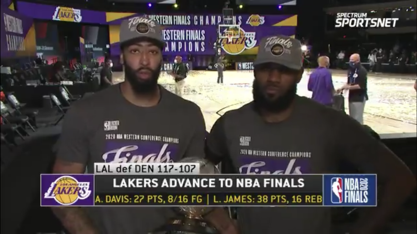 快速比分9月27日讯 在今日结束的西部决赛第五场中,湖人以117-107击败掘金,系列赛大比分4-1昂首挺进总决赛。赛后,湖人前锋安东尼-戴维斯和勒布朗-詹姆斯