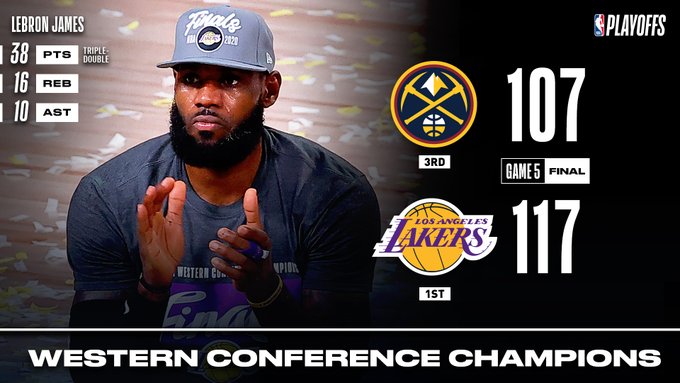 快速比分9月27日讯 在今日结束的西部决赛第五场中,湖人以117-107击败掘金,系列赛大比分4-1昂首挺进总决赛。 本场比赛,湖人球员勒布朗-詹姆斯出场