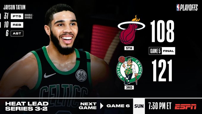 快速比分9月26日讯 今日,凯尔特人以121-108战胜热火,收获了本场比赛的胜利,将系列赛大比分改写为2-3. 随后,根据凯尔特人记者Jared Wei