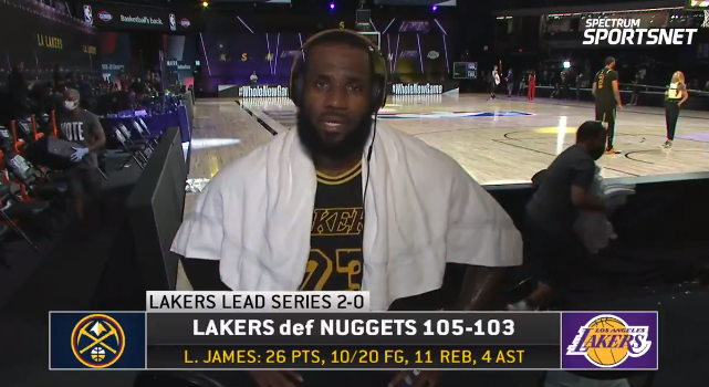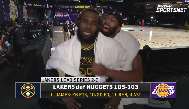 快速比分9月21日讯 在今日结束的西部决赛第二战中,凭借安东尼-戴维斯的压哨三分绝杀,湖人以105-103击败掘金,系列赛大比分2-0领先。赛后,湖人球员勒布朗