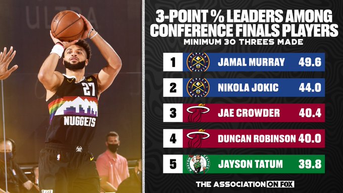 快速比分9月20日讯 媒体发布了目前进入分区决赛的球员季后赛三分命中率榜单。 在投进至少30记三分的球员中,掘金后卫贾马尔-默里(49.6%)和中锋尼古拉