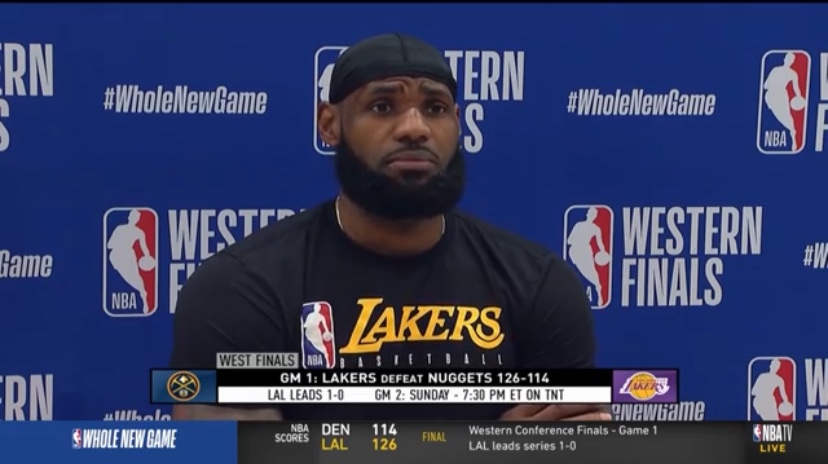 快速比分9月19日讯 在今日结束的西部决赛G1中,湖人以126-114击败掘金,取得系列赛1-0领先。赛后,湖人前锋勒布朗-詹姆斯接受了采访。 谈到自己看