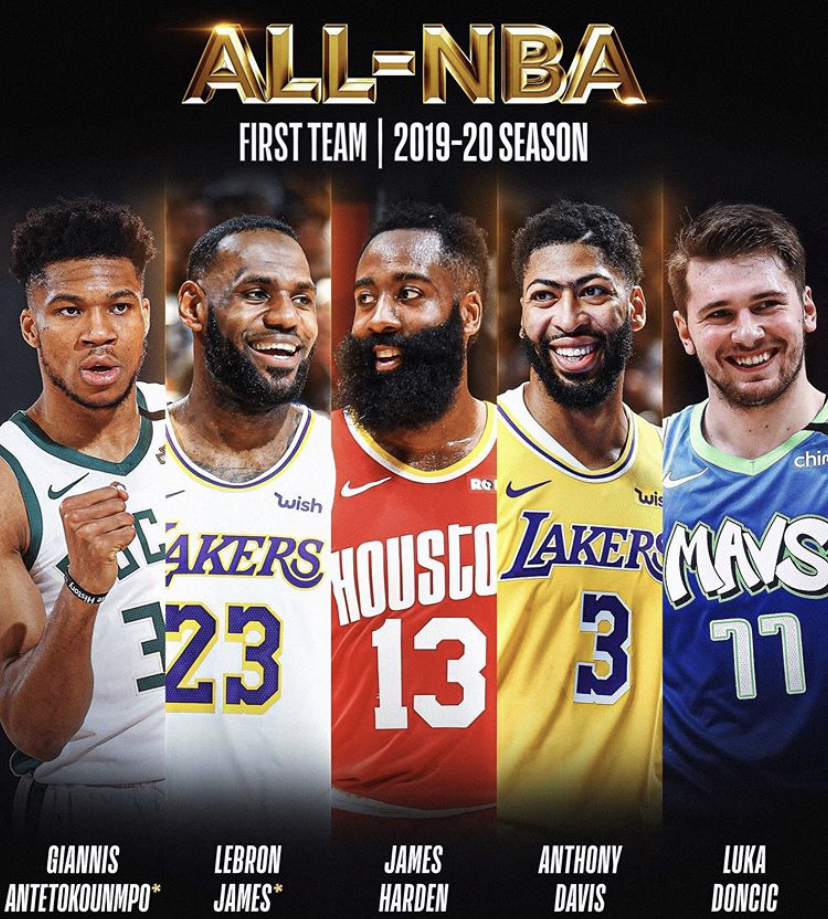 本赛季最佳阵容一阵:字母哥詹姆斯戴维斯哈登东契奇