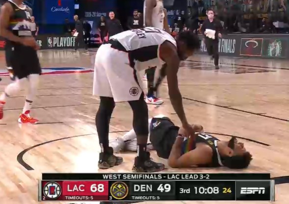 快速比分9月14日讯 目前快船对阵掘金的比赛正在进行,比赛进行至第三节。 掘金球员贾马尔-默里在一次上篮过程中与保罗-乔治发生碰撞,随后失去平衡摔倒在地。