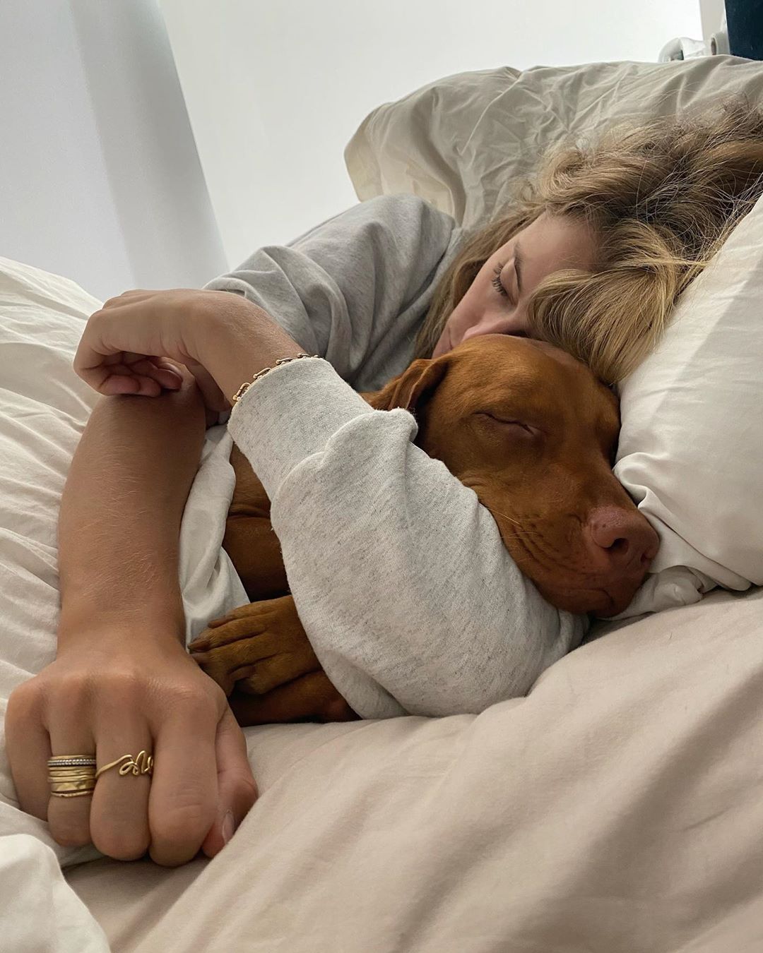 快速比分9月14日讯 今日,骑士前锋凯文-乐福的女友Kate Bock更新了个人Instagram,晒出自己抱着爱犬Velstry睡觉的照片。 乐福女友写