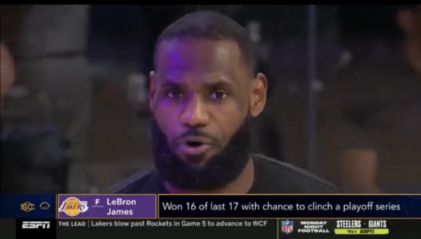 快速比分9月13日讯 在今天的比赛中,湖人119-96击败火箭,系列赛4-1晋级西部决赛。赛后,湖人前锋勒布朗-詹姆斯在场边接受了采访。 “我们知道他们在